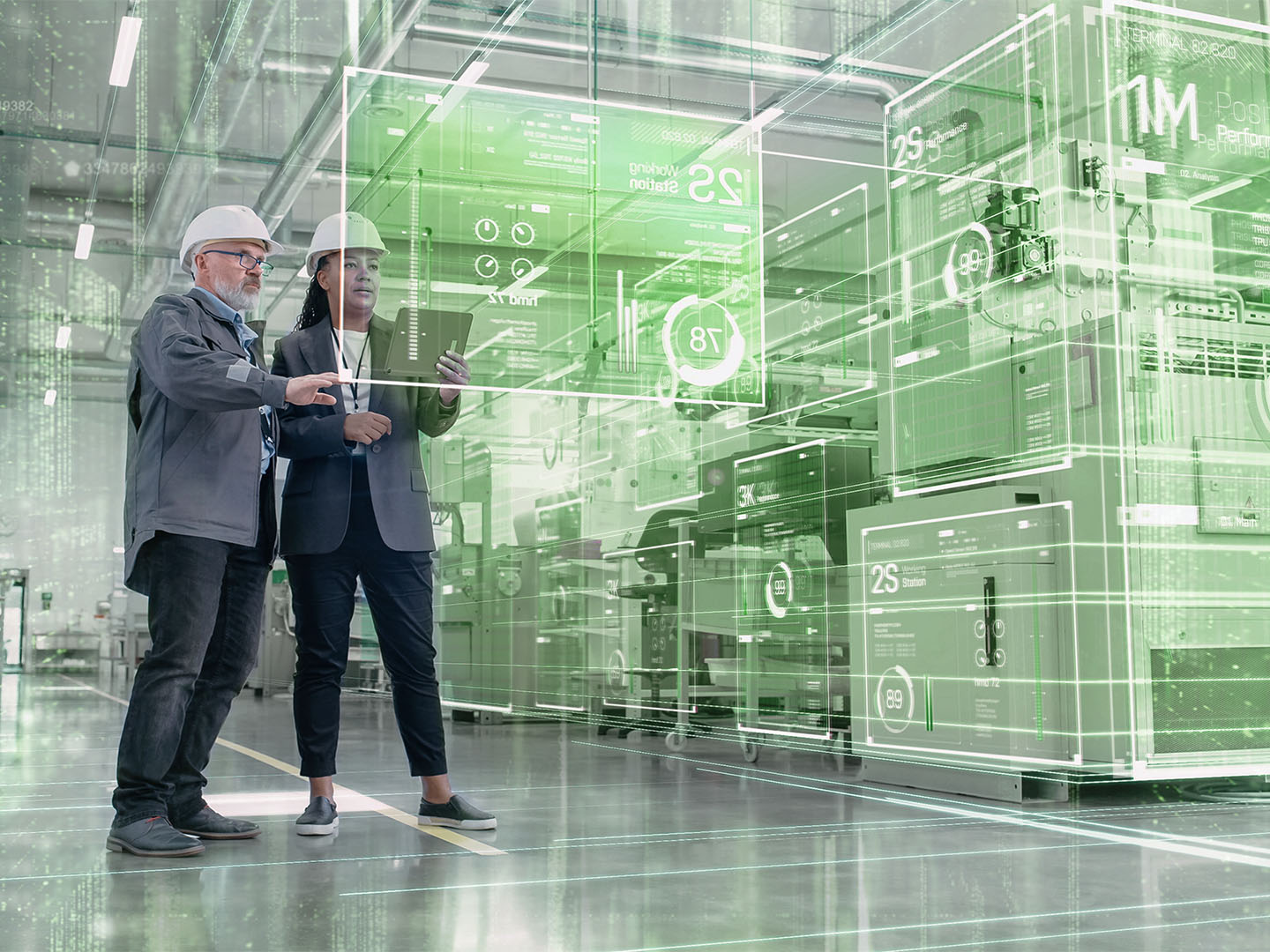 Zwei Ingenieure mit 3D Modell eines digitalen Zwillings